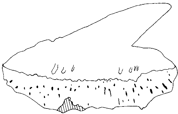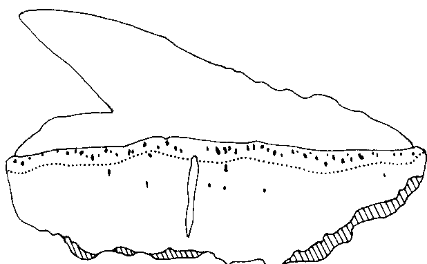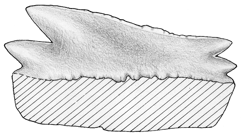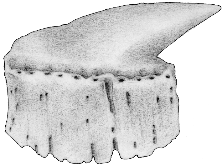 Der juvenile Zahn ist äußerst zart gebaut und labio-lingual stark komprimiert. Aus einer niederen Kronenbasis entspringt eine schlanke nach distal gerichtete Spitze, die weit über das distale Ende des Zahnes hinausragt. Die mesiale und distale Schneide ist fein, scharf und absolut glatt. Labial kann der Übergang vom Zahnschmelz zur Wurzel nicht genau festgelegt und nur durch die Lage der Foramen ungefähr bestimmen werden. An der Kronenbasis sind auf der gesamten Länge der Lingualseite zahlreiche, schwache Schmelzwölbungen ausgebildet. Die Grenze zur Wurzel ist dadurch eindeutig festgelegt. Die Wurzelfläche ist leicht konkav gewölbt und zeigt mesial wie distal schwach ausgebildete Depressionsflächen. Der linguale Wurzelwulst wird etwa in der Zahnmitte von einem Nährkanal durchschnitten; weitere Foramina sind über die ganze Wurzelfläche verteilt, treten jedoch gehäuft unmittelbar unterhalb der Kronenbasis auf.