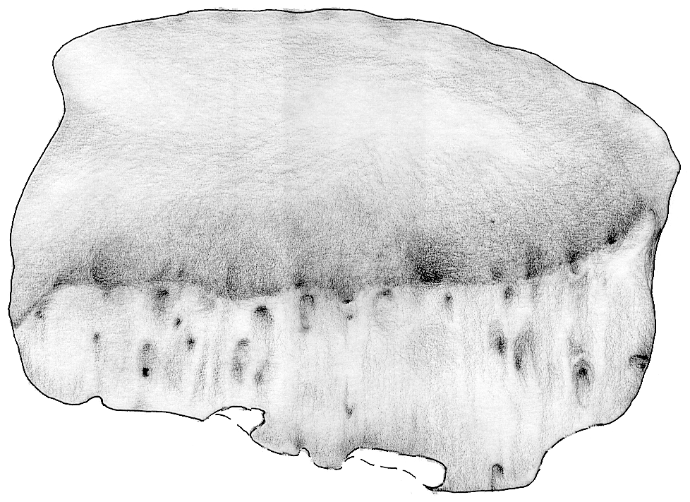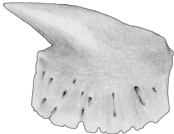 Der Mundwinkelzahn ist sehr robust und massiv gebaut. Aus dem hoch aufgewölbten Kronenbasis entspringt eine nur schwach ausgebildete, stumpfe Kronenspitze. Die mesiale Schneide ist grob gekerbt; der distale Kronenrand glatt und geht ohne Einkerbung zum hohen, distalen Talon über. Durch die feinen, vertikal verlaufenden, scharfen Schmelzfalten am unteren Rand der Krone entstehen kleine Schmelzhöhlen, die sich über die ganze Zahnbreite erstrecken. Auch auf der Labialseite sind am Basalrand der Krone sanfte Eindellungen des Zahnschmelzes zu beobachten. Der Übergang zur niedrigen Wurzelfläche ist klar definiert. Auf der Lingualsiete können leichte Wurzeldepressionen festgelegt werden. Der labiale Wurzelwulst tritt kräftig hervor und wird durch die Öffnung eines zentralen Foramens durchbrochen. Auf der schmalen Fläche bis zur Kronenbasis öffnen sich wieder eine Vielzahl in Größe und Lage unterschiedliche Foramina.