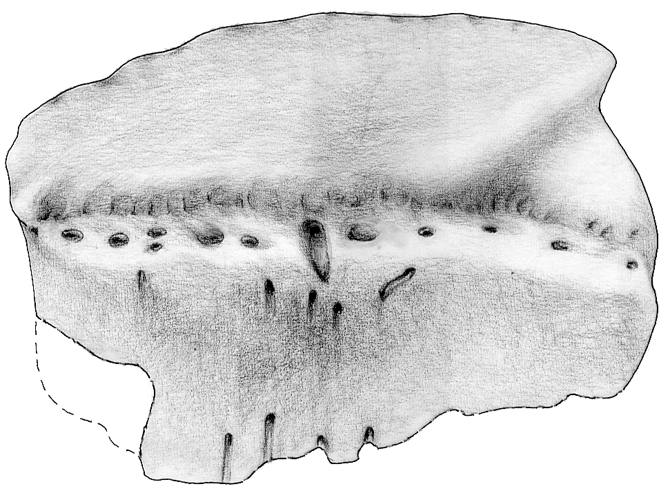 Die Wurzel ist eine lang gestreckte, sehr flache, rechteckige Platte mit einer gut herausmodulierten Wurzelprotuberanz auf der Lingualseite. Auf der schmalen Fläche zum Kronenbasisrand sind ungewöhnlich viele Foramina ausgebildet; meist ist das Zentralforamen in der Größe gut erkennbar von den übrigen abgehoben. Auch auf der labialen Wurzelfläche sind über die gesamte Zahnbreite und Wurzelhöhe unterschiedlich große Foramina verteilt.