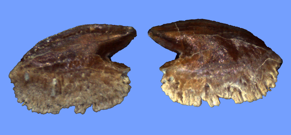 Beschreibung: Die Zähne dieser Echinorhinus Art sind sehr stark labio-lingual komprimiert. Die Zähne besitzen eine relativ schlanke, in der Regel deutlich nach distal geneigte Hauptspitze. Die Hauptspitze reicht dabei mindest bis zum distalen Rand des Zahnes, oftmals sogar leicht darüber hinaus. Der normalerweise deutlich fein gekerbte mesiale Kronenrand weist nur eine schwache konvexe Wölbung im vorderen Drittel der Krone auf. Eine Einkerbung, wie sie zum Beispiel bei E. pfauntschi im unteren Drittel des Kronenrandes ausgeprägt ist, fehlt. Mesiale Nebenspitzen sind grundsätzlich nicht vorhanden. Bei Zähnen von adulten Tieren kann jedoch distal vor dem äußersten distalen Rand eine spitz aufgerichtete oder stumpfe Nebenspitze ausgebildet sein. Die distale Kronenbasis ist niedrig und kurz ausgebildet. Vom basalen Kronenrand sind insbesondere bei adulten Zähnen labial und lingual kurze und feine Schmelzfalten ausgebildet.