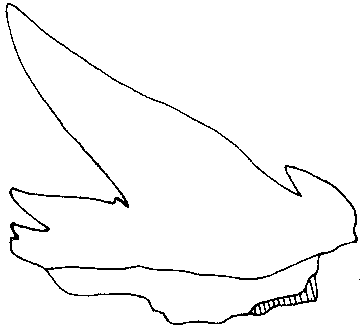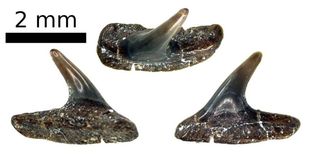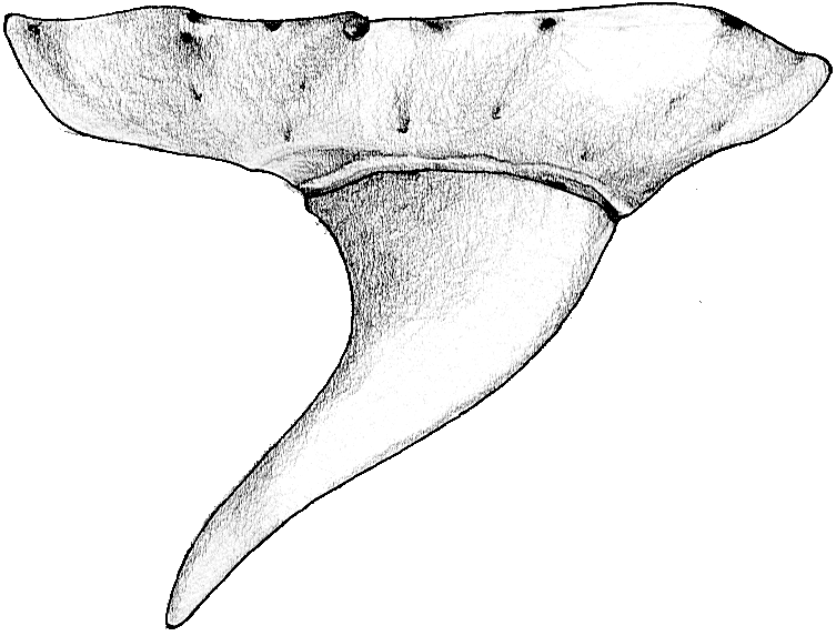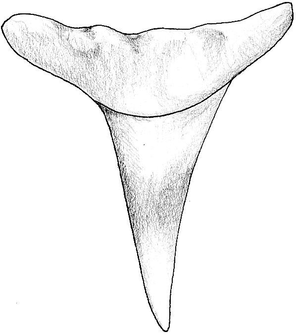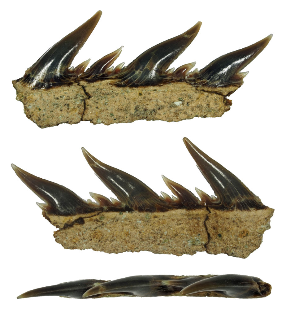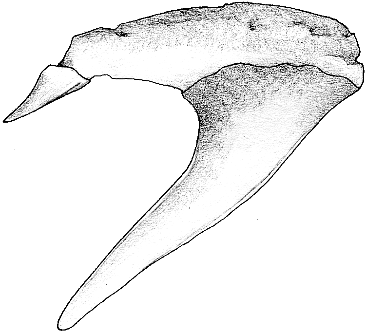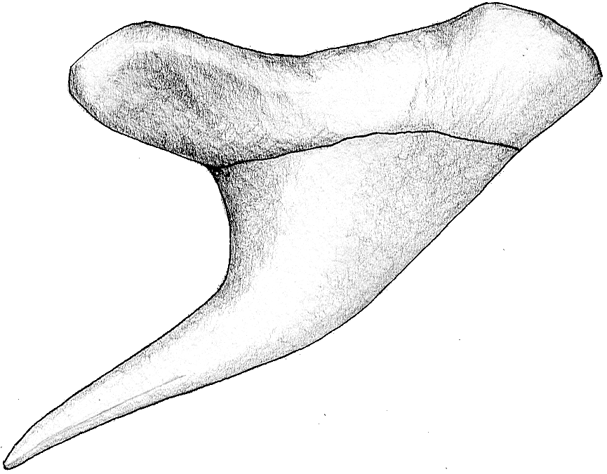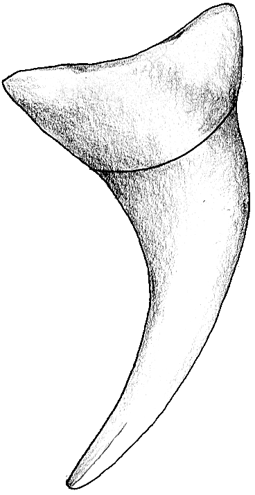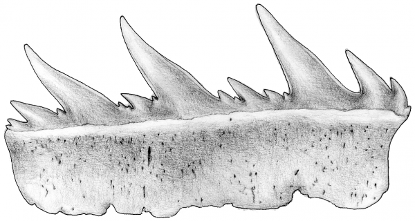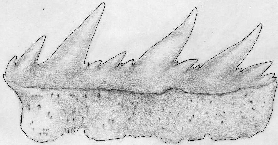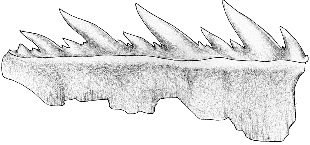 Die Spitze des Symphysenzahnes ist nahezu senkrecht aufgerichtet. Bei den folgenden Zähnen ist sie sigmoidal gekrümmt und stark zum Mundwinkel hin geneigt. Im Übergang zu den Lateralzähnen ist eine isoliert stehende, kleine, distale Sekundärspitze in großem Abstand zur Hauptspitze ausgebildet.