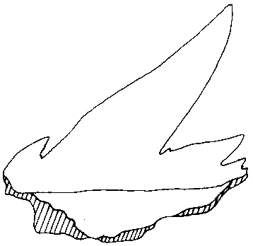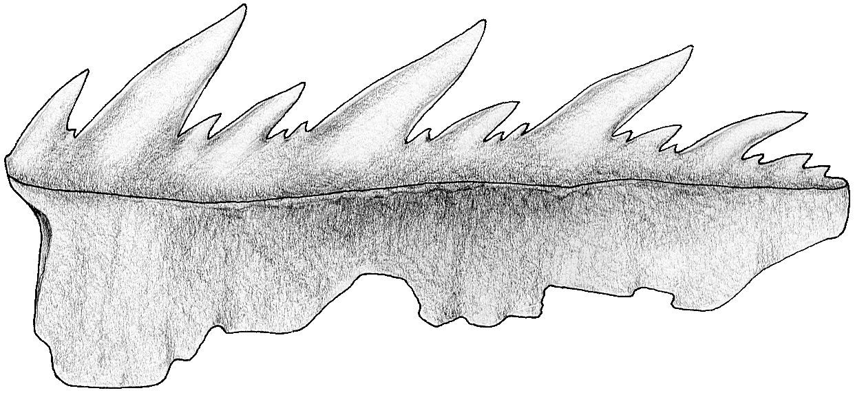 Die wechselnde Abfolge verschieden großer Zahnspitzen beginnt am Mesialrand der Krone mit einer sekundären Spitze, der ein, manchmal auch zwei Nebenspitzchen vor und /oder nachgestellt sein können. Der Abstand zwischen den drei Hauptspitzen ist über die gesamte Zahnbreite gesehen unterschiedlich groß. Die größte Lücke befindet sich zwischen der 1. und 2. Spitze, dazwischen ragt mittig eine sekundäre Spitze hervor, die mesial und distal von zwei oder auch drei in der Größe variablen Nebenspitzchen flankiert wird. Auch in der Lücke zwischen der 2. und 3. Hauptspitze steht eine sekundäre Spitze, die nun aber mesial nur von einer, distal in der Regel meist von zwei Nebenspitzchen eingerahmt ist. Eine weitere sekundäre Spitze findet man schließlich am distalen Ende der Zahnkrone. Bei Betrachtung des Gesamtbildes der Krone erweckt sie manchmal den Eindruck einer reduzierten Hauptspitze. Sie wird ebenfalls von mehreren, unterschiedlich großen mesialen und distalen Nebenspitzchen begleitet. Schematisiert dargestellt, ergibt sich daraus die unten aufgeführte Abfolge der verschiedenen Zahnspitzen.
