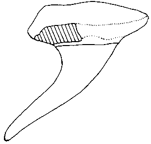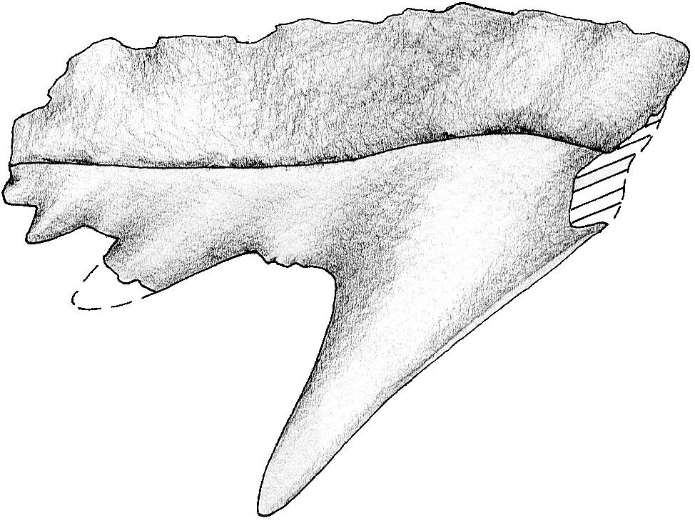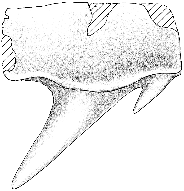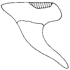 Die nahezu rechteckige Wurzelplatte ist labio-lingual komprimiert mit ausgeprägter lingualer Protuberanz. Sie zeigt jedoch am Mesialrand keine Einbuchtung, sondern ist ganzrandig vorgezogen. Dies deutet darauf hin, dass sich die Oberkieferzähne im Kiefer gegenseitig nicht berührt haben.