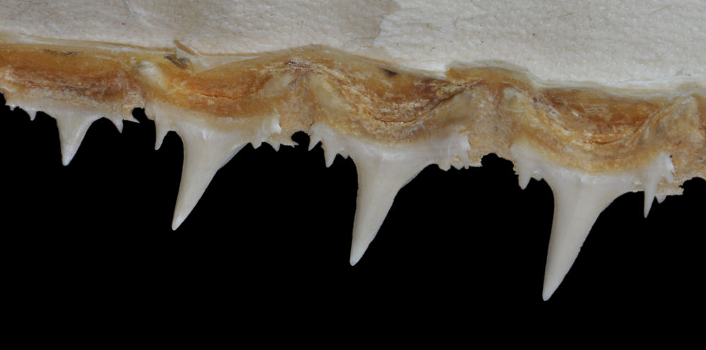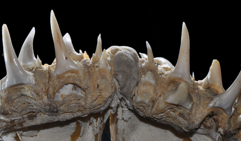 Bei den Lateralzähnen ist die Schneide gut ausgebildet, sie ist jedoch nicht sehr scharf und reicht bis zur Kronenbasis. Bei den postero-lateralen Oberkieferzähnen franst der untere Teil des distalen Schneidenrandes in viele kleine Zäckchen aus. Bei diesen Zähnen ist die Streifung des basalen labialen Schmelzrandes ganz markant ausgebildet. Es treten kräftige Schmelzleisten auf, die in ihrem apikalen Teil teilweise zu kleinen Spitzchen ausgezogen sind. Die Außenseite der Kronen ist immer deutlich gewölbt. Die Lateraldentikel  sind auffallend hoch und spitz. Sie sind in ihrem Querschnitt fast kreisrund und kommen mehrpaarig vor.